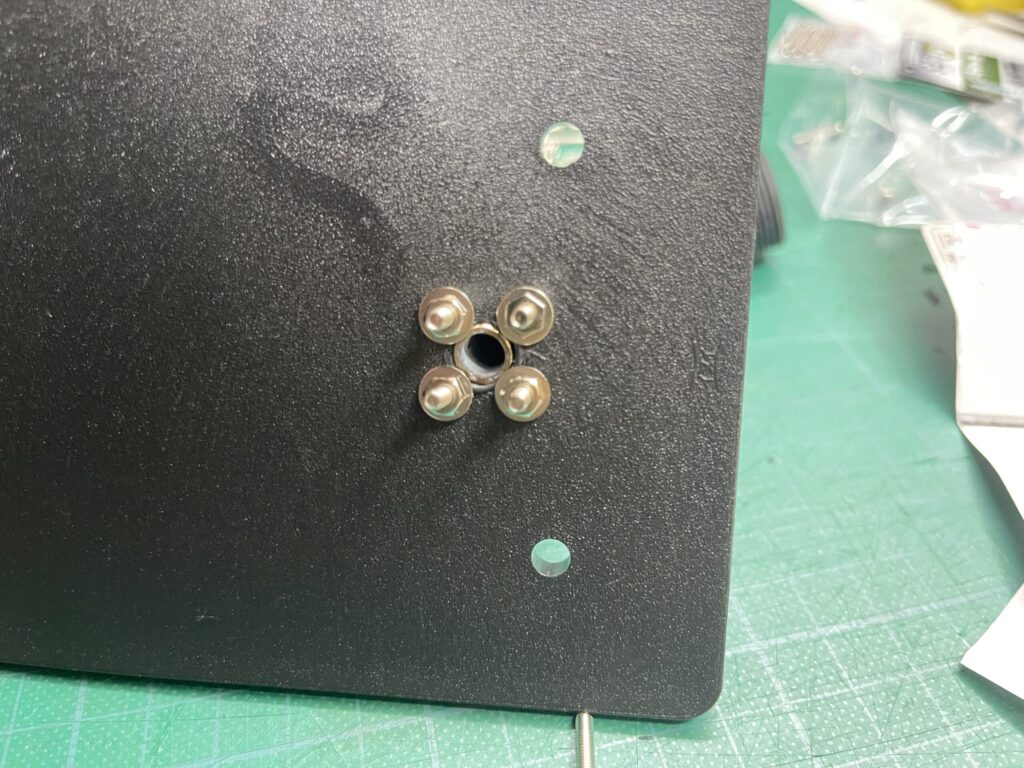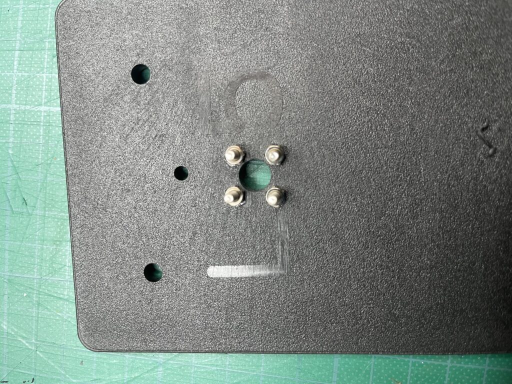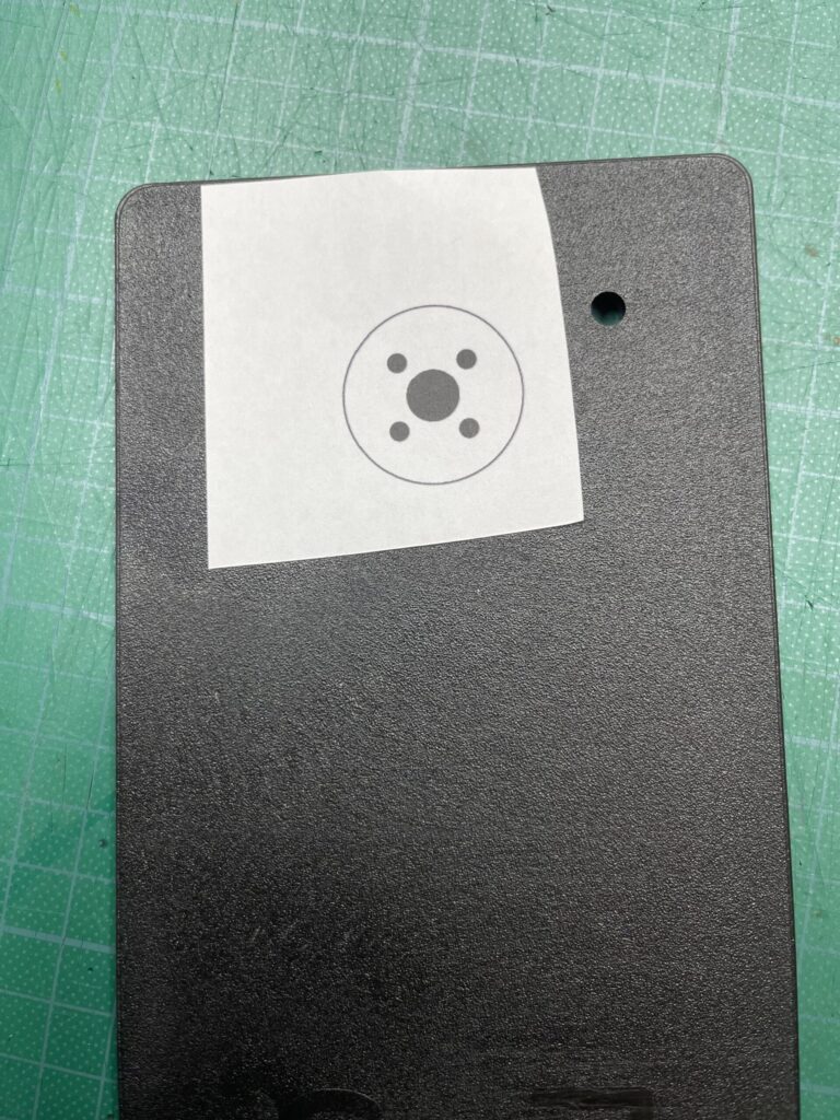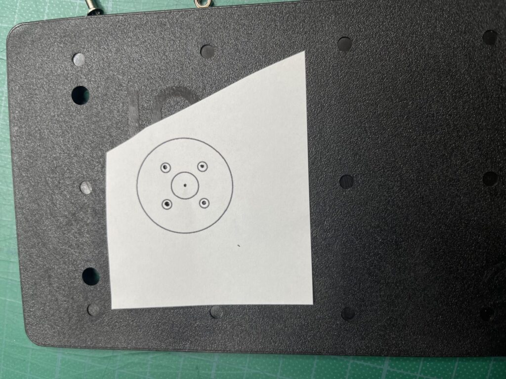 これを写真のようにしるしをつけて、直径9㎜で中心円にドリルで穴を開ける。4つの穴は下穴キリで直径2.5㎜の穴を開ける(ここはギリギリの大きさが良いです)。